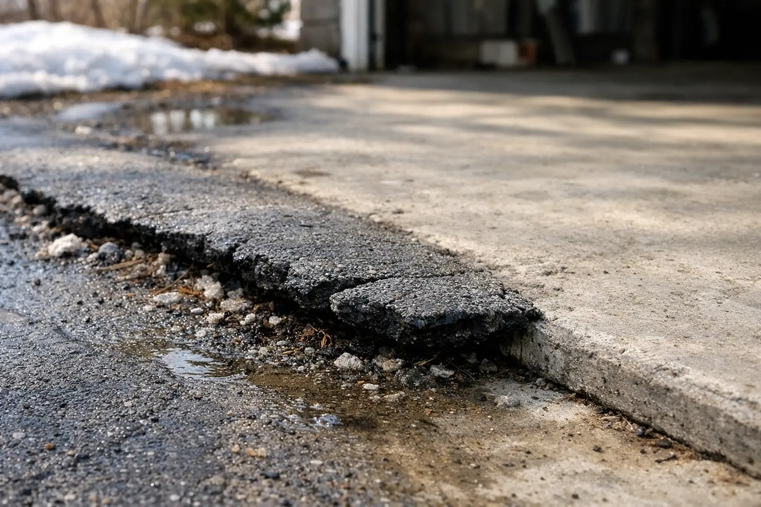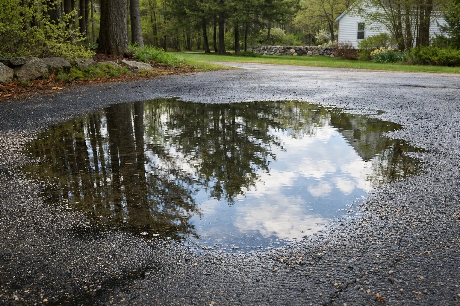 Water is the absolute arch-nemesis of asphalt. During mud season, the ground is already saturated, which means any additional rain or snowmelt has nowhere to go but across the surface of your driveway.